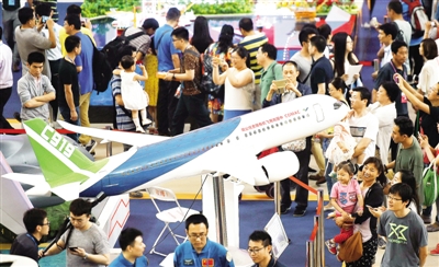 6月5日,正在北京展览馆举行的国家“十二五”科技创新成就展迎来周末观展高峰。图为参观者在C919大型客机模型前驻足观看。新华社记者 陈晔华摄