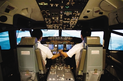 6月16日,广州首台波音B737-800型全动态模拟机在九元航空广州总部启用。据介绍,该模拟机“驾驶舱”内部安装有先进的全景模拟系统,可以为驾驶波音系列机型的飞行员提供初始训练、转机型训练、升级训练、定期复训等课目的全面训练。图为飞行员在模拟机中模拟飞行。新华社记者 吴鲁摄