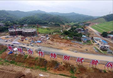 由广东省和广西壮族自治区共同建设的粤桂合作特别试验区位于广东肇庆、广西梧州两市的交界地带。站在粤桂合作特别试验区江南的一处观景平台上俯瞰,数千亩土地已平整完毕,工程车辆来来往往,远处丰歌低碳科学建造基地等多个项目已经率先开工,厂房地面部分正在抓紧建设。谁曾想到,人迹罕至的荒山野岭,经过建设者们两年多夜以继日的推山造地,现在变成了一马平川,大批项目即将进驻。