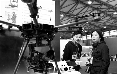 图为参观者在观看一架装备有4K高清视频拍摄设备的无人机。新华社记者 方喆摄
