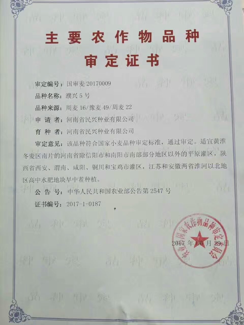 近日,农业部发布2547号公告,公布了2017年通过国家审定的26个小麦新品种,其中由我县民兴种业选育的“濮兴5号”(审定编号:国审麦20170009)。该品种填补了濮阳市自2005年以来没有国审小麦品种的空白,结束了南乐县没有国审品种的历史,也是南乐县实施粮丰科技工程取得的巨大成绩。