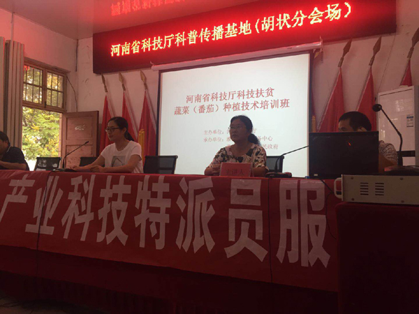 此次培训班邀请了河南省番茄等蔬菜产业科技特派员服务团为大家做专业指导。在培训会上,河南省番茄等蔬菜产业科技特派员服务团应芳卿研究员为胡状镇农民、种植户讲授了设施番茄优质高效栽培技术,从设施类型、品种选择、播期、施肥和病虫害控制、重茬防治等方面详细的讲解了番茄相关栽培技术。团员赵英凯讲解了辣椒秋延后栽培技术,从品种选择、土壤处理、栽培管理和病虫害防治等方面为贫困户讲解了辣椒的栽培技术。