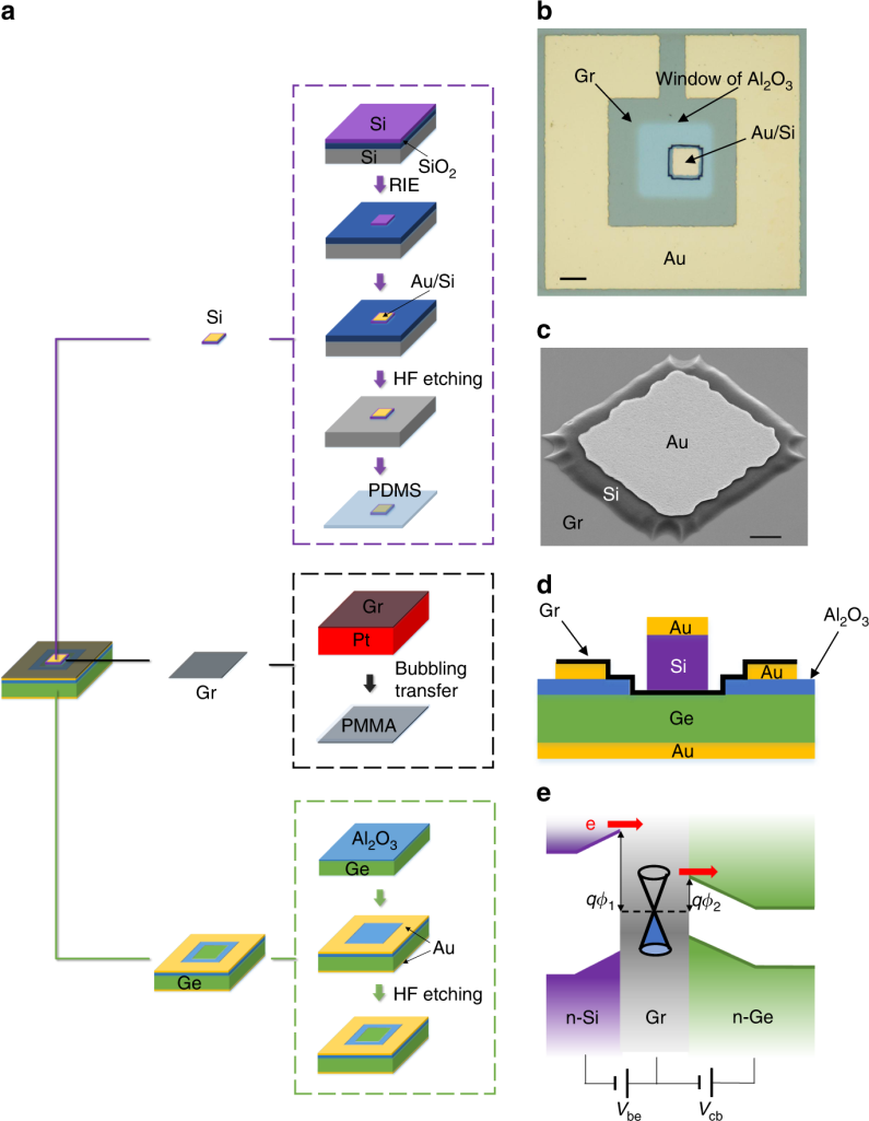 目前已报道的石墨烯基区晶体管普遍采用隧穿发射结,然而隧穿发射结的势垒高度严重限制了该晶体管作为高速电子器件的发展前景。”该研究团队负责人表示。他们通过半导体薄膜和石墨烯转移工艺,首次制备出以肖特基结作为发射结的垂直结构的硅-石墨烯-锗晶体管。