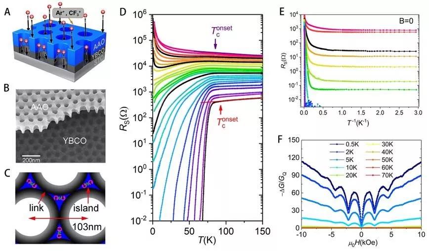 图A-C:纳米多孔超导薄膜示意图;图D-E:电阻温度输运曲线;图F:量子磁导振荡曲线( 电子科技大学供图)