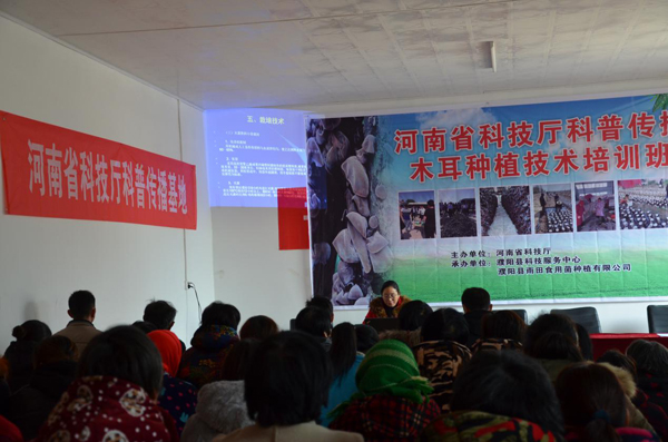 为进一步推进科技特派员助力脱贫攻坚工程,充分发挥科普传播基地的示范带动作用。 2019年 11月 28日 ,濮阳县科技局科技服务中心在子岸镇中子岸村村室内召开河南省科技厅科普传播木耳种植技术培训班。培训班邀请到了省派产业服务团和研究员黄桃阁、崔杏春讲授木耳和平菇的种植技术,到场参加培训的贫困户农民及种植户130余名。