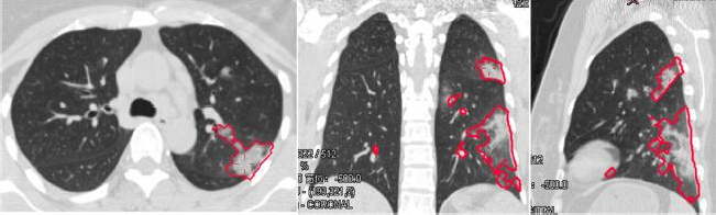 据郭佑民介绍,该辅助诊断系统的关键核心采用了人工智能结合传统的计算机视觉技术,对新冠肺炎患者肺部病变区域进行分割、计算,可以同时获取病变区域的体积、密度、磨玻璃成分等定量参数,尤其是对于患者随访的数据,可以实时进行图相配准,精准定位病灶位置、大小,方便比较病变的消长。
