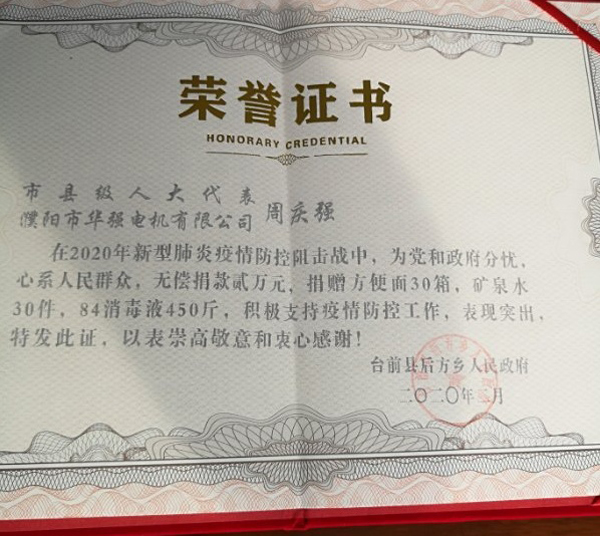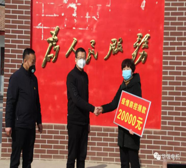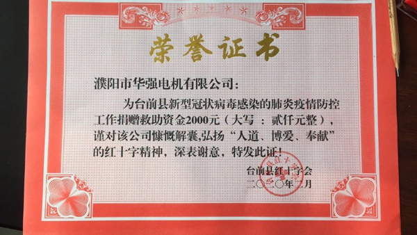 进入新年以来,新型冠状病毒肺炎疫情日趋严峻,国家兴亡,匹夫有责,为了支持疫情防控工作。科技型中小企业----濮阳市华强电机有限公司后方乡政府捐赠了30箱方便面、30箱矿泉水、600斤84消毒液2万元现金又向台前县红十字会捐款2000元,合计价值3.2万余元为全面打赢这场“战疫”,贡献一份力量