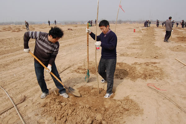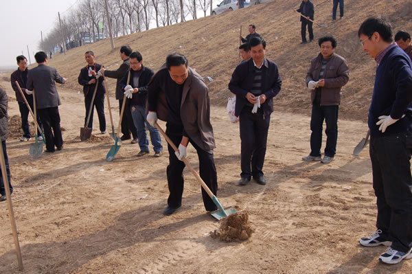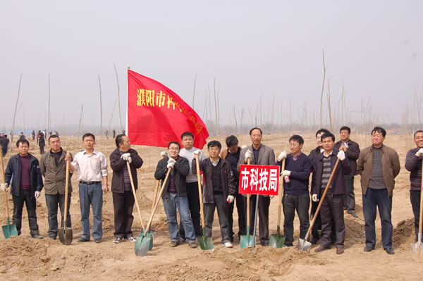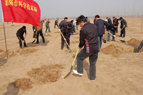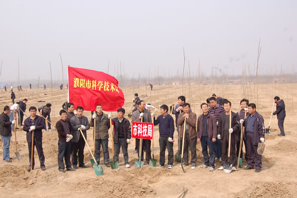 3月13日是星期天,上午春意融融,市科技局34名干部职工在局党组书记、局长吴社法的带领下驱车前往台前县张庄段黄河大堤,积极参加义务植树活动。经过一上午的奋战,共刨坑225个,栽树210棵,圆满完成了上级交给的植树任务。局党组成员、知识产权局局长祝宇飞,副调研员王建华也参加了此次活动。