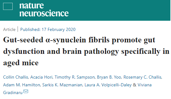 由于PD患者肠道神经元中也存在α-Syn团块,因此有些研究人员推测它们首先出现在肠道神经系统中。该观点认为,蛋白质聚集后在神经元之间传递,从肠神经系统向上到达迷走神经并进入大脑,并在此过程进一步促进蛋白质团块的形成。
