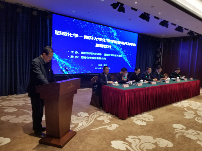 朱守非介绍了南开大学基本情况和化学学院发展历程,希望与迈奇化学等企业的合作能够以点带面,加深双方了解,突破固有模式,为濮阳企业技术升级提供支撑,为学院科研提供需求信息,为成果转化提供产业支持,实现共赢。