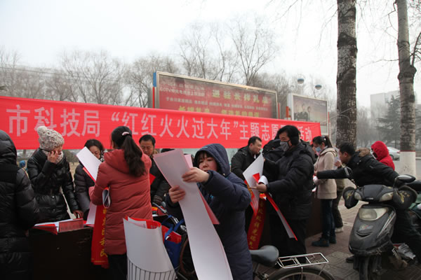 1月12日,市科技局组织果木蔬菜、医疗、电脑专家在人民路中段开展主题志愿服务活动,为我市人民欢度一个愉快、文明、祥和、健康向上的春节提供有力支撑。这次活动主题是“我为红红火火过大年助力”,主要特点:一是突出科技宣传,更新观念。出动科技宣传车,在城区巡回播放科技信息、科技生活知识、反邪教知识,使广大市民充分认识科技,走进科技,崇尚科学,反对迷信,提高科技助力生活幸福指数提高的能力,为我市实现“二三五”奋斗目标,建设富裕和谐美丽新濮阳贡献力量。二是突出专家义诊,保障健康。邀请市中医院专家义诊,对前来咨询的居民耐心讲解预防和治疗常识,测量血压,推介中医药科普知识,提高居民健康水平。三是送科技信息,科技帮富。邀请果木专家、电脑专家现场向居民讲解庭院经济、花卉、果木修剪技术,推介电子商务常识,提高居民应用现代技术提高生活水平的能力。四是送春联,红火过年。开展义务送春联活动,在悠然欣赏春联的意境中,提高居民文化氛围,为我市居民红红火火过年助力。这项活动发放各类资料1600份,咨询居民1500人次。