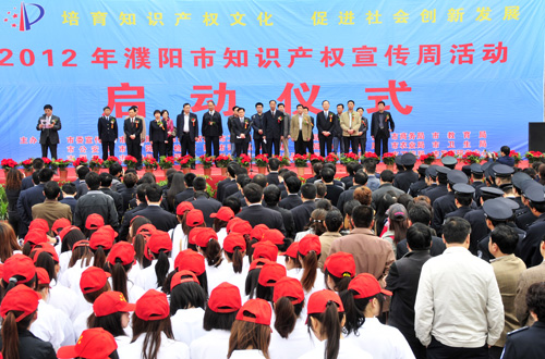 2012年濮阳市知识产权宣传周活动是按照国家、省统一部署举办的一次大型知识产权宣传教育活动,宣传周活动由濮阳市知识产权战略工作领导小组办公室牵头,市知识产权局会同市委宣传部、市科技局、市工商局、市文广新局、市发改委、市商务局、市教育局、市公安局、市中级人民法院、市人民检察院、市司法局、市财政局、市人社局、市农业局、市卫生局、市国资委、市质监局、市工信局、市国税局、市林业局、市食品药品监管局、市政府法制办、市发展研究中心等24个部门和单位联合举办,活动的主题是“培育知识产权文化,促进社会创新发展”,活动的目的是为了庆祝